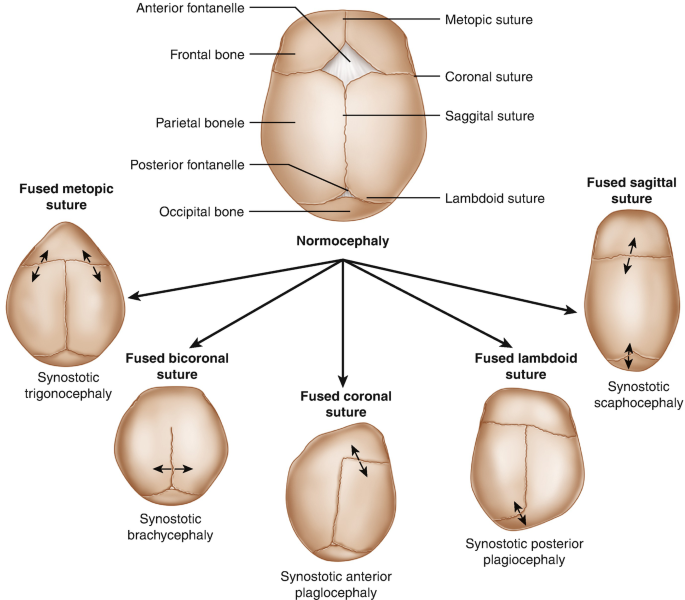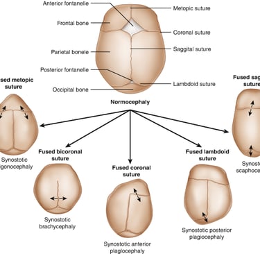 Craniosynostosis occurs due to the premature in-utero fusion of one or more cranial sutures. These sutures allow for passage through the birth canal and, later in development, allow the expansion and growth of the underlying brain. When these sutures close prematurely, the head shape becomes altered depending on the sutures involved. Most cases involve a single suture and are classified as non-syndromic. However, Crouzon, Pfeiffer, and Apert syndromes have been associated with multi-sutural craniosynostosis. The treatment of craniosynostosis involves surgical intervention to unlock the fused sutures, ensuring unrestricted brain development and correcting cosmetic deformities.